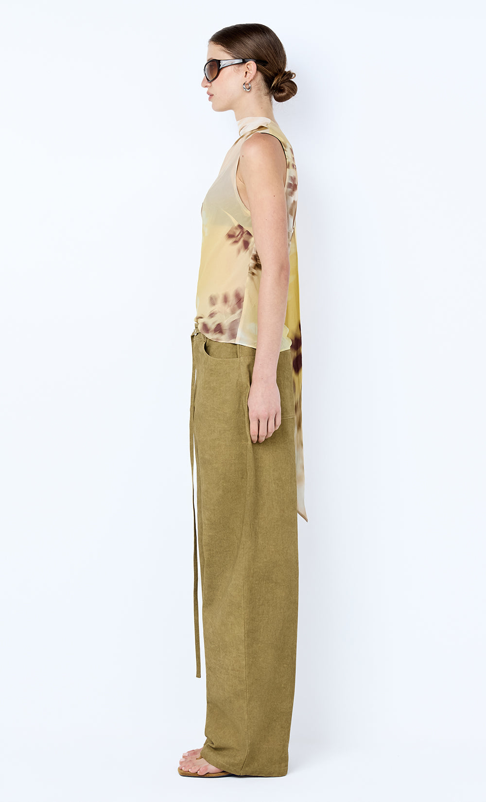Blaise Scarf Top in Palmera Floral. An asymmetric scarf-style top with a draped cowl neckline and neck tie, layered over a contrast chocolate mesh bra. Designed to be worn alone or layered, this piece works for evenings out or elevated event dressing.