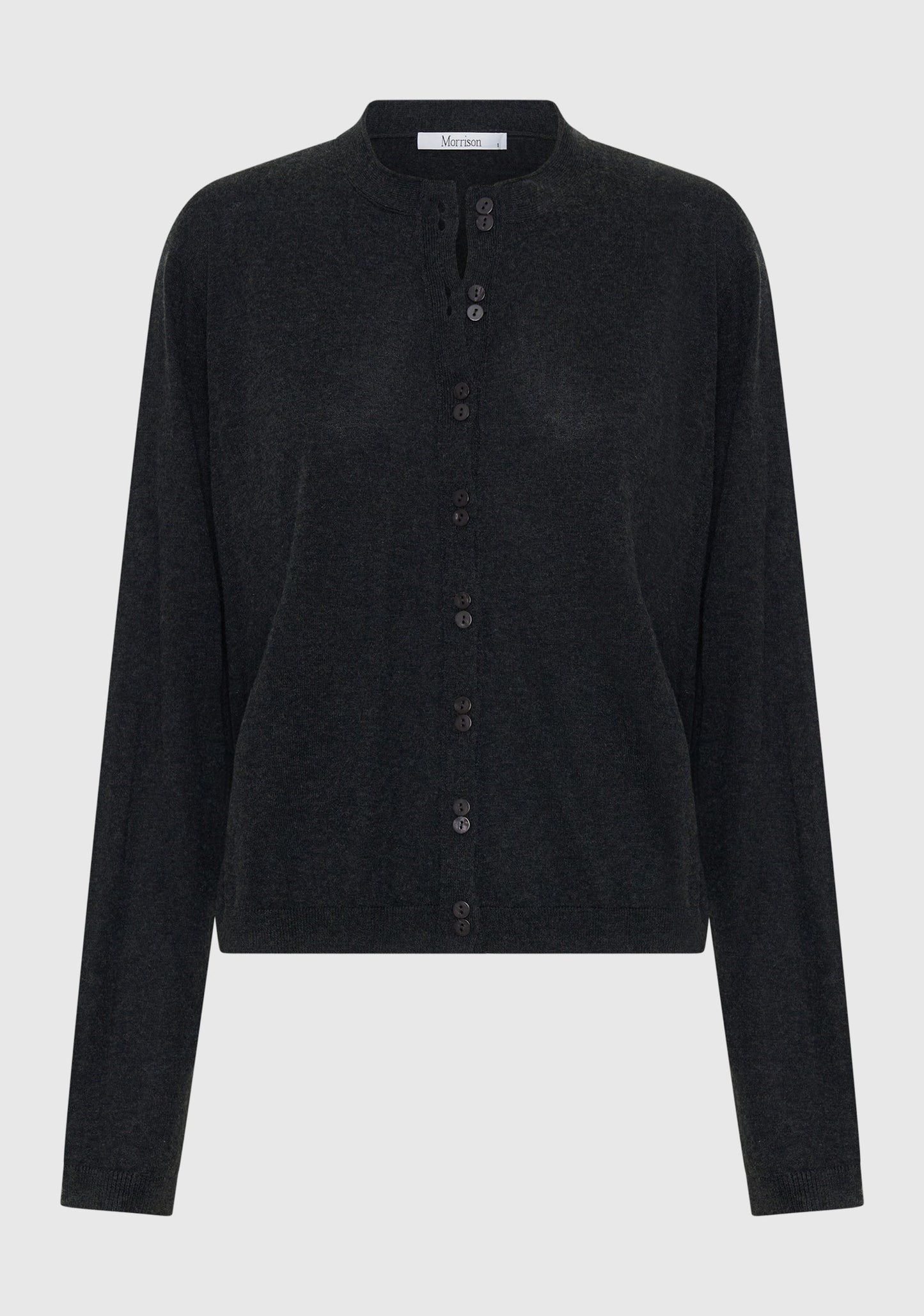 A refined knit crafted from a luxurious silk–cashmere blend, offering a soft, lightweight feel. Designed with a self-roll edged neckline and a button-front opening, it features full-length sleeves and a neat, flattering fit. Finished with ribbed trims at the neckline, placket, cuffs, and hem for a polished touch.