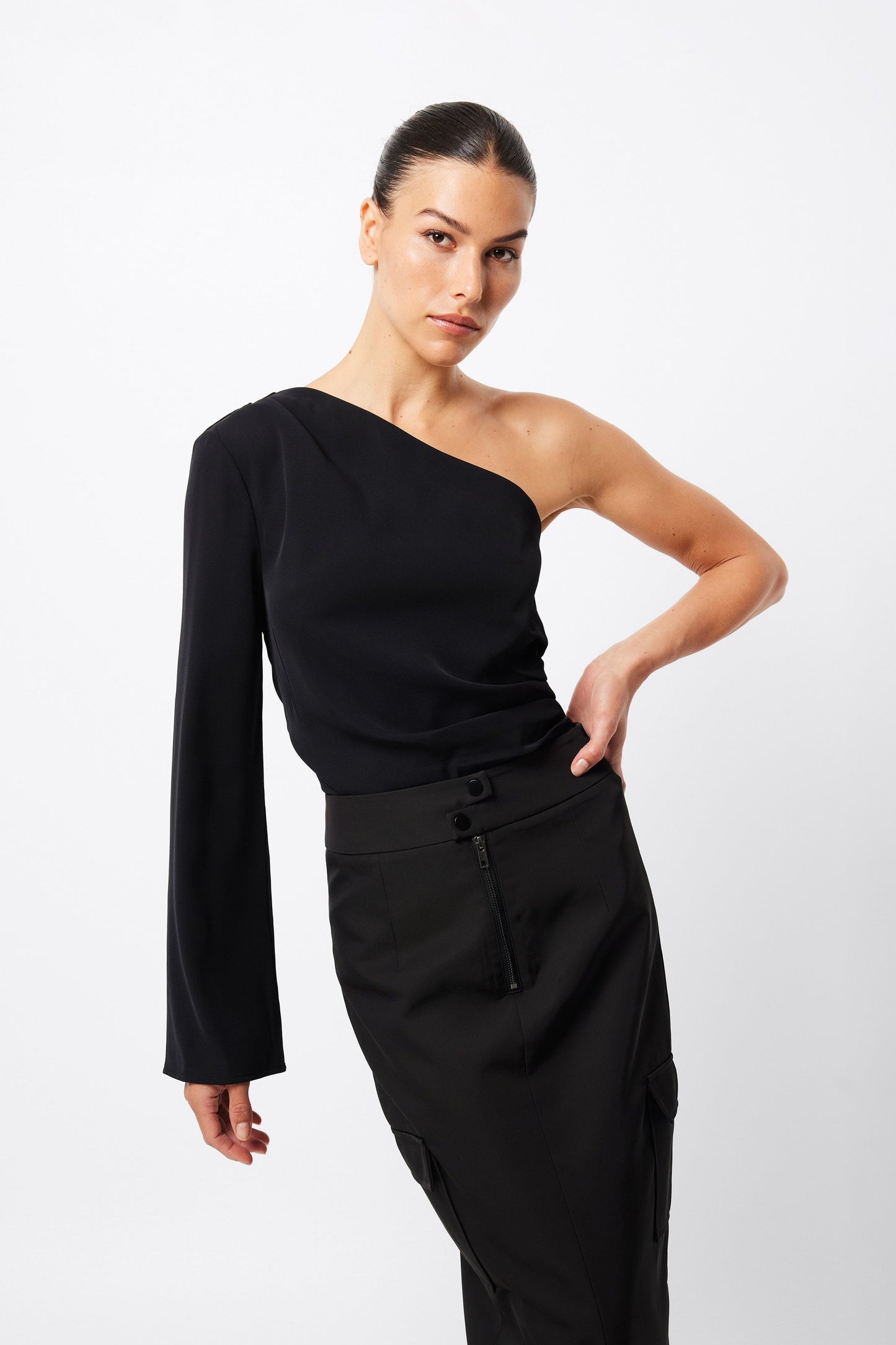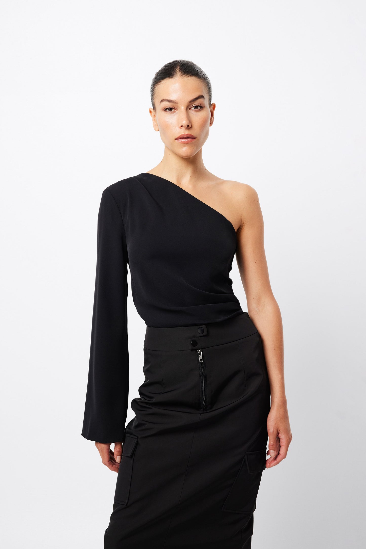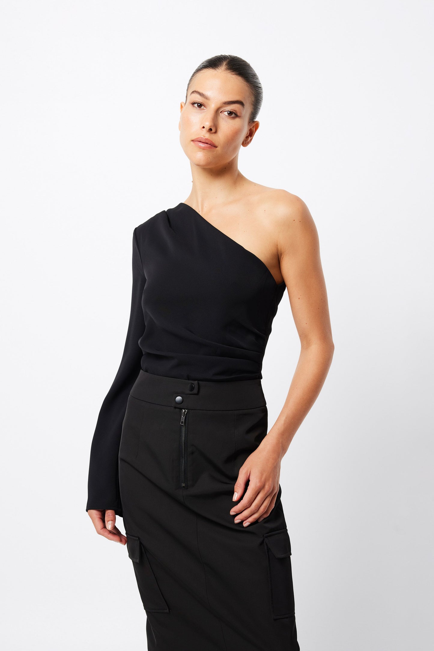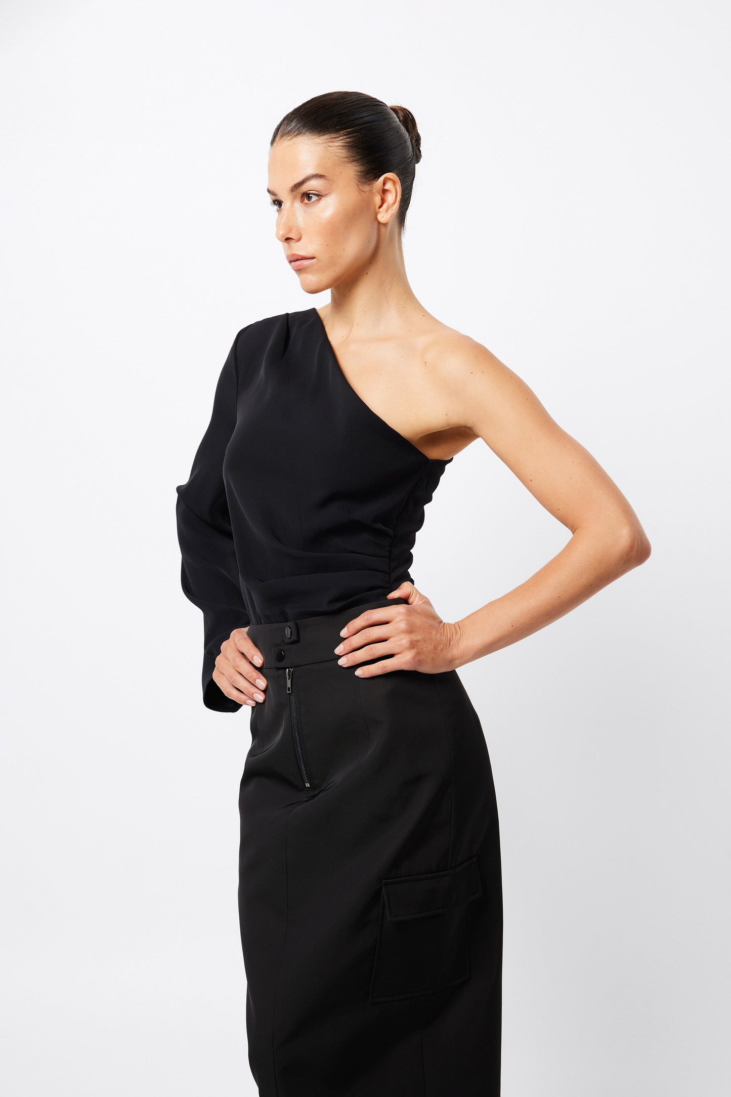 Regular price $30.00The Novel Top in Black has a striking one shoulder design with flattering side ruching. It's the perfect choice for adding a touch of sophistication to any outfit. Pair this with tailored pants to take you from boardroom to bar, or dress down with denims for drinks with girlfriends