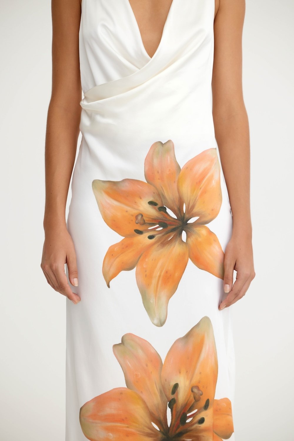 Regular price $140.00The Elaina Dress in Tigerlily is a sleek, bold piece for any special occasion. Fully lined for a smooth fit, the bodice crosses over at the front, with elegant draping into pleats at the side for a flattering silhouette. The hand painted placement print adds an artistic touch, while the low back is finished with delicate rouleau halter ties and gold cord ends for a touch of luxury.